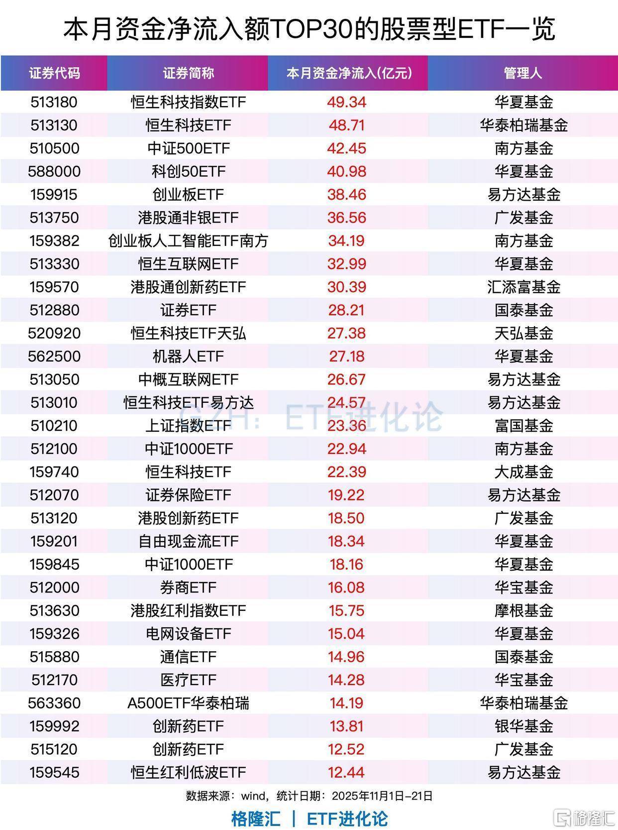 Wind数据宗旨,港股通非银ETF、证券ETF、证券保障ETF、目田现款流ETF、券商ETF、港股红利指数ETF、电网开辟ETF等本月均获超15亿元的资金净流入。