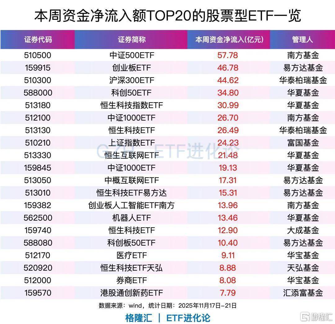本周ETF资金累计净流入界限达701.21亿元,中证500ETF、创业板ETF、沪深300ETF、科创50ETF、恒生科技指数ETF、中证1000ETF、恒生科技ETF、上证指数ETF、恒生互联网ETF本周资金净流入居前。