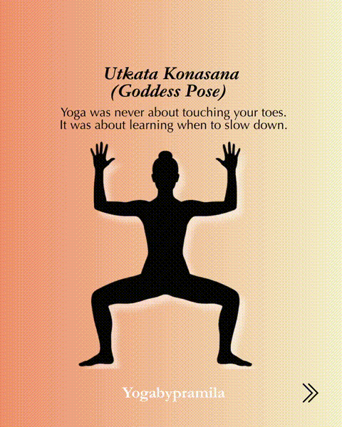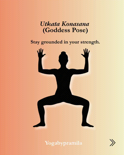 女神式:吸气,双脚分开,脚趾微微向外。呼气,盘曲膝盖,作念女神式。