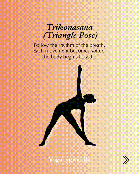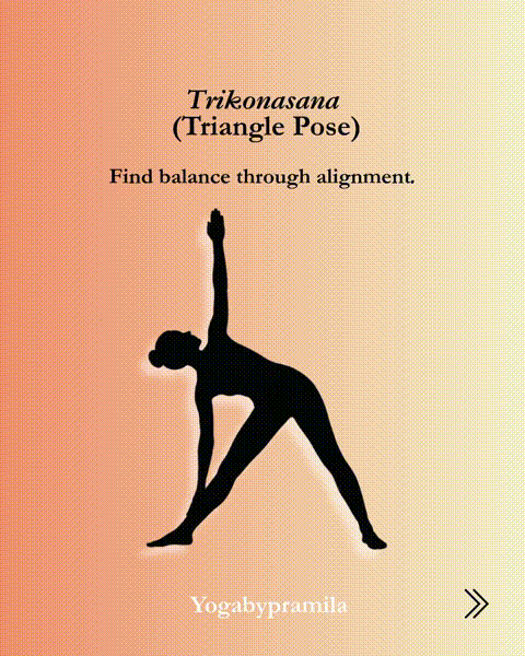 三角式:吸气,双脚向右转,双臂伸展,与地板平行。呼气,向右伸展躯干。将右手放低至脚踝或小腿,将左臂伸向天外。吸气,胸部向天外旋转。