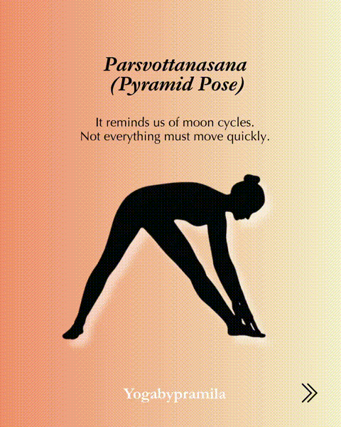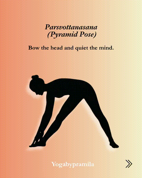 金字塔式:呼气,放下左臂,用右手因循右脚,进一步旋转后脚,折叠向右腿。